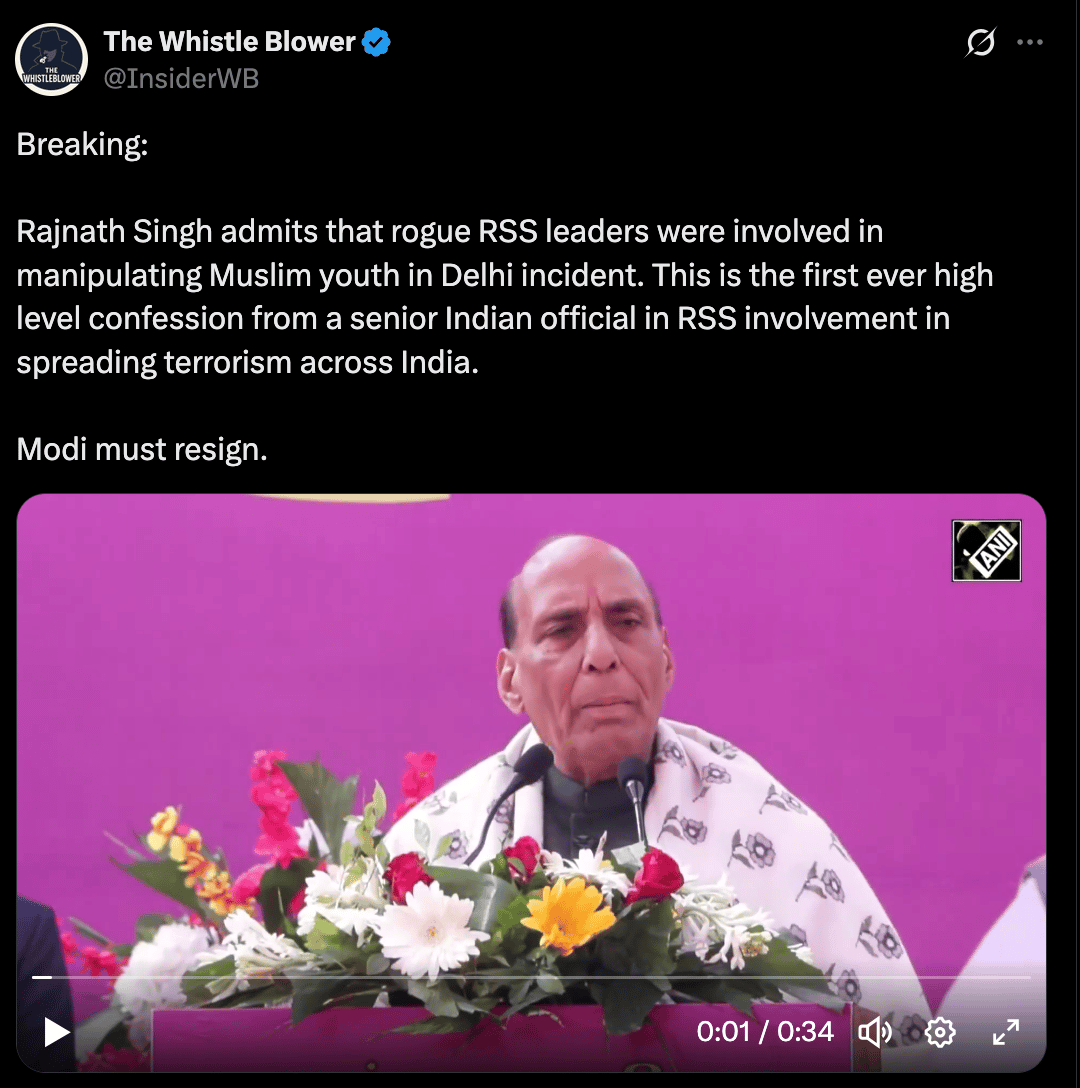 The Claim: Video shows Rajnath Singh admitting that “rogue RSS leaders” manipulated Muslim youth and were involved in the 2025 Delhi bomb blast.